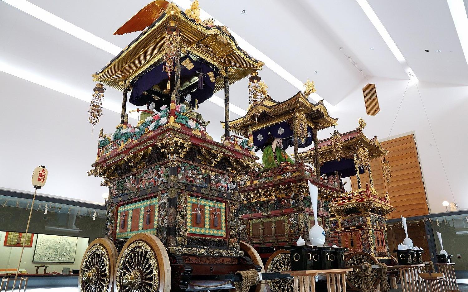The exhibition hall displays three Hikiyama floats at all times, accompanied by the elegant Hikiyama festival music.