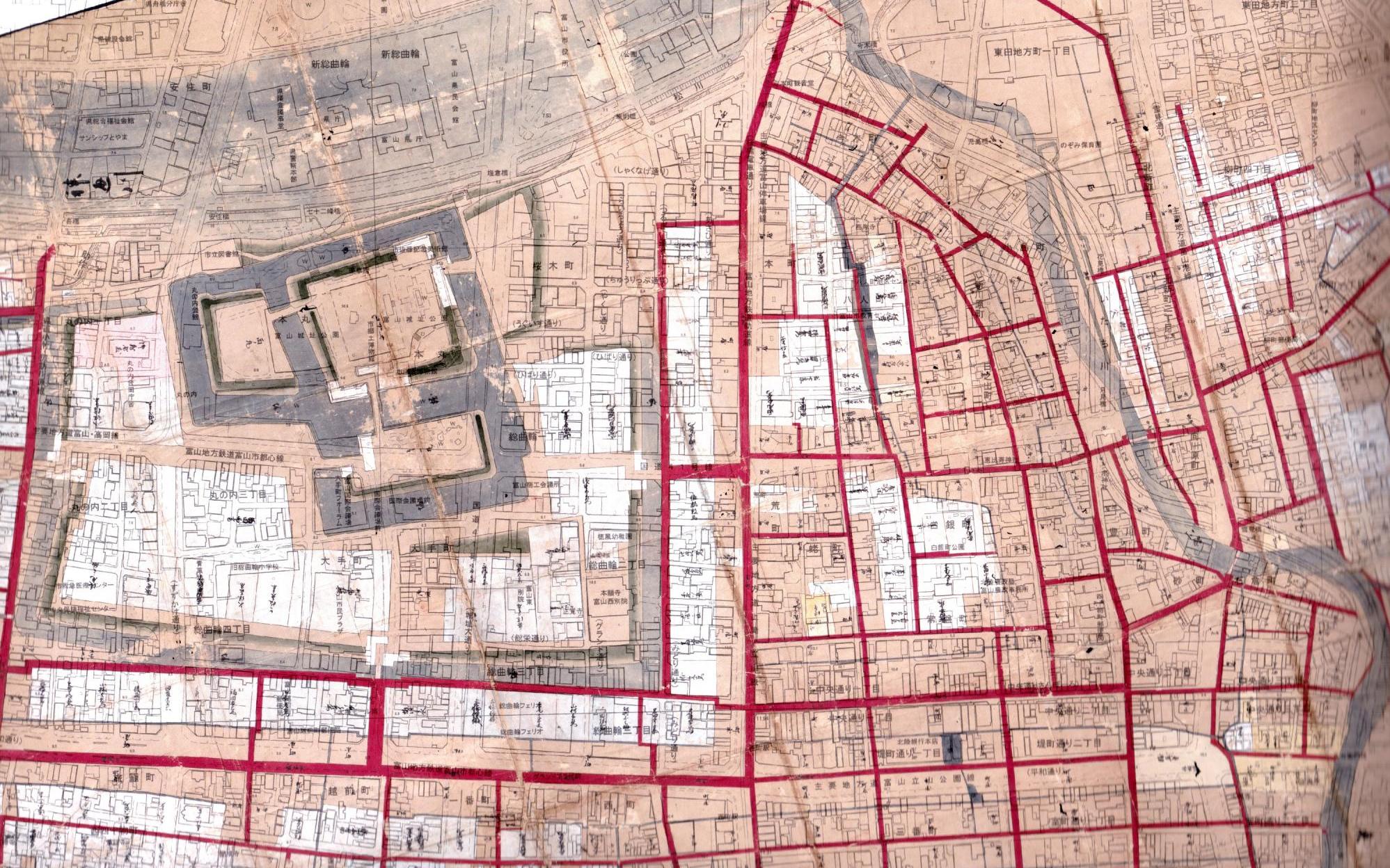 The city of Toyama flourished around Toyama Castle. A large river called Jinzu River used to flow through the north side of the castle, and the castle town spread out on the south side of the castle, where the “medicine business” has flourished since the Edo period.